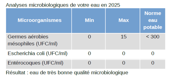 Le résultat des analyses pour Prilly en 2025 est une eau de très bonne qualité microbiologique.