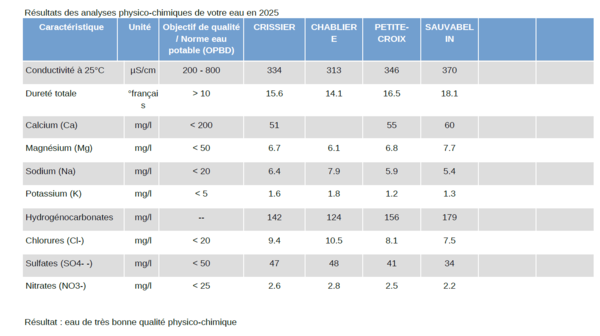 Le résultat des analyses chimiques pour Prilly en 2025 est lui aussi une eau de très bonne qualité.